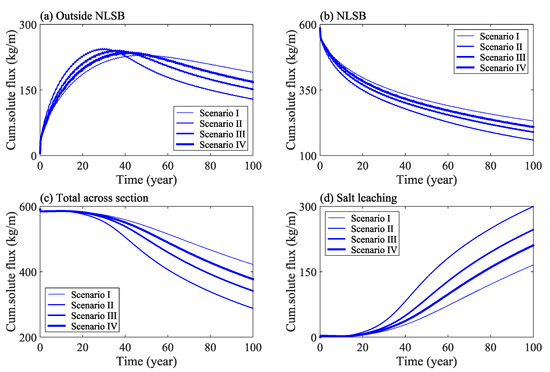 The cumulative flux of solute in the study area under different water levels is shown in Figure 6. The results indicate that the total amount of solute outside of the NLSB first increases and then decreases with time (Figure 6a), whereas the total amount of solute inside the NLSB decreases gradually (Figure 6b). In addition, the total amount of solute in the cross section of the dam decreases gradually with respect to time; with the solute moving out of the calculation domain from the boundary surface (Figure 6c), and the total amount of salt leaching increasing gradually (Figure 6d).