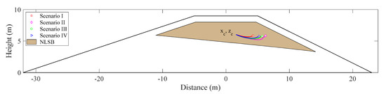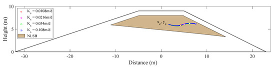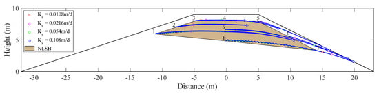 In this study, each of the simulations used a 9 m high earth embankment with upstream and downstream slope ratios of 1:3 and 1:2, respectively. The initial low, normal, and high water levels were 2.5, 5.5, and 8.5 m, respectively. NLSB is located 1.0 m below the embankment outline and 1.0 m above the initial phreatic line.