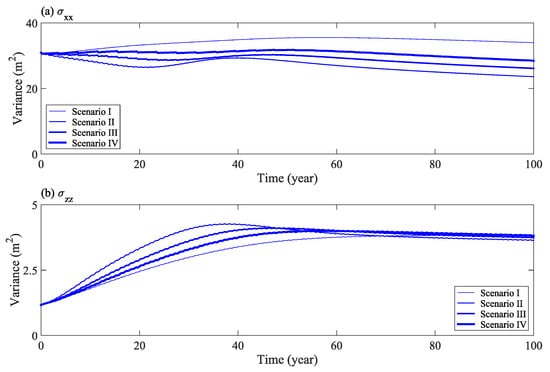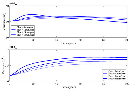 Second moment of solute distribution (horizontal σxx (a) and vertical σzz (b) components) under different water levels.