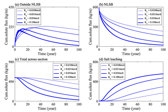 The cumulative flux of solute in the study area under various saturated hydraulic conductivities is shown in Figure 10. The results show that when the saturated hydraulic conductivity doubled from 0.0108 to 0.0216 m/day, the total amount of solute at the outside of the NLSB, inside the NLSB, and in the cross section of the embankment decreased by approximately 30%, and the total amount of salt transport and leaching increased by 77%. Under the four calculation conditions of saturated hydraulic conductivity, when time = 100 years, the average concentration of solute in the interior of NLSB decreased from 8 g/kg (initial) to 3, 2.1, 0.8, and 0.2 g/kg, respectively. Salt can be leached out by moving to the tail water boundary (HI in Figure 2) and seepage face boundary (GH in Figure 2) in the calculation domain. Considering the saturated hydraulic conductivity of 0.108 m/day as an example, at time = 100 years, the total amount of solute leached out ratio by GH and HI is 365:1; hence, the seepage face is the main channel of solute transport.