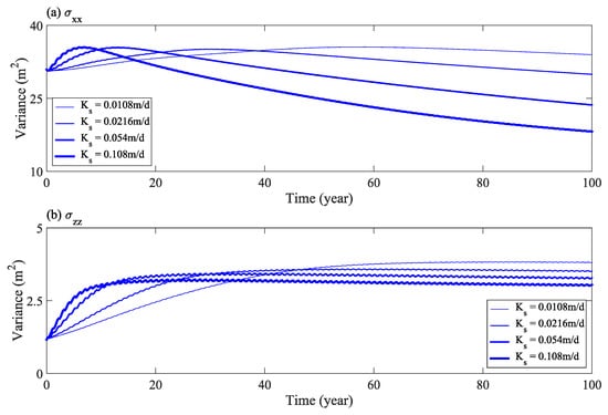 Second moment of solute distribution (horizontal σxx (a) and vertical σzz (b) components) under various saturated hydraulic conductivities.