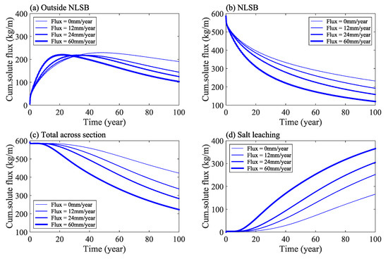 The cumulative flux of solute in the study area under different rainfall infiltration conditions is shown in Figure 14. Considering the rainfall infiltration, the movement of water and salt is accelerated. The results show that when the rainfall infiltration flux increases from 0 to 12 mm/year, the total amount of solute at the outside of NLSB, inside the NLSB, and at the cross section of the dam decrease by 24%, 17%, and 20%, respectively, and the total amount of salt leaching increases by 55%. Under the four conditions of infiltration flux calculation, when time = 100 years, the average concentration of solute in NLSB decreases from 8 g/kg to 3, 2.5, 2.0, and 1.5 g/kg, respectively.