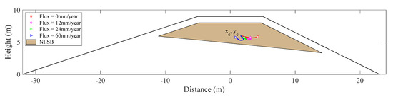 The trajectory of solute centroid under different rainfall infiltration conditions is shown in Figure 15. The results show that the center of mass, first, moved toward the seepage surface of the downstream slope. Next, with an increase in rainfall infiltration, the solute near the side of the downstream slope gradually moved out of the calculation domain from the seepage surface, and the center of mass tended to deflect to the upstream slope.