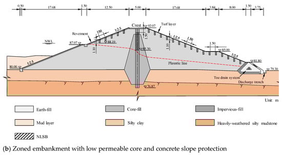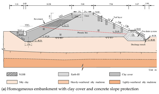 The basis of NLSB technology is to control a termite invasion by adding NaCl in soil (silt loam) to satisfy the specifications of the physical and chemical indices of soil used for filling the embankment [31]. According to the mechanical test of NaCl-laden soil, when NaCl concentration in soil is less than 3%, the physical properties of soil change slightly, which then satisfy the relevant specifications [44]. A nest built by subterranean termites in an earth embankment is generally located 1.0 m below the surface and above the phreatic line of the earth embankment [45]. Figure 2 schematically depicts the NLSB structure in an earth embankment.