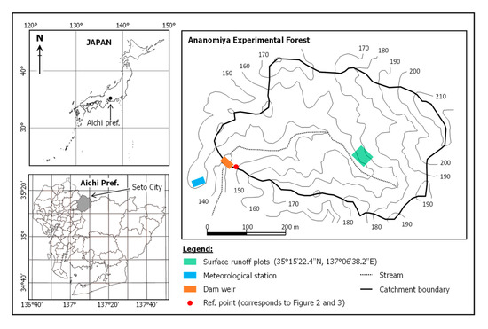 - Ecohydrology Research Institute. Map of Ananomiya Experimental Forest; Ecohydrology Research Institute (Archive): Seto, Japan; Available online: https://www.a.u-tokyo.ac.jp/english/institute_e/ai-uforests.html (accessed on 19 April 2021).