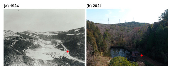 Experimental plots were set up in the 13.9-ha Ananomiya Experimental Forest of the Ecohydrology Research Institute, the University of Tokyo Forests, in Seto city, Aichi prefecture (Figure 1). The general area, traditionally known as the Eastern Owari Hills, is known for a long history of ceramic and pottery production. As a result of intensive timber harvesting to be used as kiln fuel, the area was characterised by denuded hills with bare, exposed subsoil in the past (Figure 2 and Figure 3) [24,25]. Another round of intensive timber exploitation took place during the Meiji era (1868–1912), when industrialisation in Japan was at its peak [25]. High sediment yields and landslides had been a common phenomenon. With auspices from the government, the Ananomiya Experimental Forest (AEF) area was established in 1922 by the Tokyo Imperial University (University of Tokyo, today for the purpose of restoring forests and preventing erosion-related hillslope disasters. Construction of a weir dam was completed in 1924, and hydrological and meteorological observations commenced in 1925 [24]. Although this site was severely denuded in the past, forest cover has now recovered due to restoration-planting efforts (known as “sabo planting”), where Japanese red pine (Pinus densiflora) and Japanese black pine (Pinus thunbergii) were planted as the pioneer species [24,25]. Figure 2 shows photographs of one of the hillslopes in the experimental forest in its denuded state in 1924 and recovered state in 2021. Aerial photographs (Figure 3) show the gradual recovery of forest through the years 1948, 1976, and 2010.