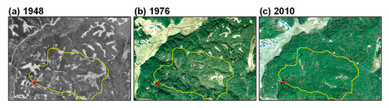 Gradual forest recovery in the Ananomiya experimental forest area. (a) White areas are bare and exposed weathered granite subsoil. (b,c) show gradual forest recovery—corresponding to the reducing bare (white) areas. The reference point (red dot) is the same as in Figure 2.