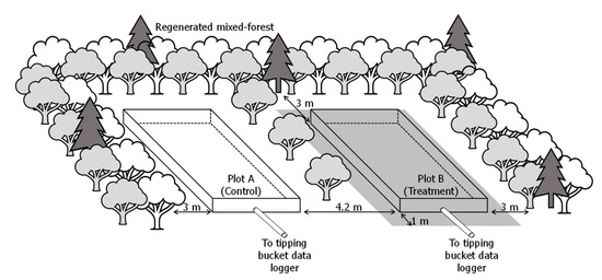 Two sloping experimental plots, A (7.4 m2) and B (8.1 m2), were established with a 4.2-m buffer in-between (Figure 4). Boundaries of each plot were created by inserting hard plastic (roofing) sheets into the ground. The boundary was made contiguous to prevent leakage of surface runoff. The mean slope for plots A and B were 35° and 28°, respectively. At the bottom boundary of each plot, a gutter was installed to collect overland flow which was then channelled via a PVC pipe to an ‘Uizin UIZ-TB200’ tipping-bucket gauge. Throughout the study period, no treatment was applied to plot A (control plot) whereas litter removal followed by clearcutting were carried out in plot B.