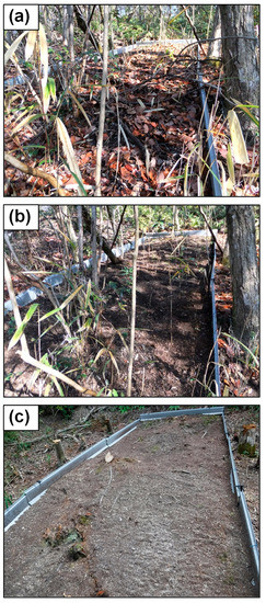 To ensure minimal disturbance to the soil surface, litter removal was carried out from outside the plot boundary and precautionary measures were taken to not step into the plot area. The dry weight of litter removed (including leaf, twigs, fruits, and seeds) was 9.48 kg (oven dried at 60 °C for 72 h). In the clearcutting phase, a total of 13 trees (species: Deutzia crenata, Eurya japonica, Gamblea innovans, Ilex pedunculosa, and Lyonia ovalifolia) with DBH ranging 0.8–3.5 cm as well as 10 small shrubs were removed from plot B. In plot A (control plot), six trees (species: E. japonica and L. ovalifolia) and small shrubs were left as they were. Although having fewer trees than in plot B, one of the trees (E. japonica) in plot A was multi-stemmed (nine stems), resulting in a canopy coverage that was more extensive than that of a normal tree. To minimise external environmental influence, areas adjacent to the plots were made to be as similar as possible to that inside the plots. Areas surrounding plot A (3 metres away from the top, left, and bottom boundary) were left forested. For plot B, a 1-metre buffer from the perimeter (plot boundary) was given the same treatment (litter removal and clearcutting) as inside the plot. Photographs of plot B in the NT, LRBC, and AC phases are shown in Figure 5.