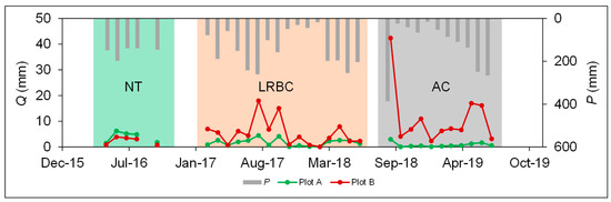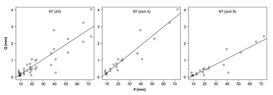 In all phases and in both plots, surface runoff (Q) increased linearly with event rainfall (P) (Figure 8). In the NT phase, strong linear relationships were found (plot A, R2 = 0.9019; plot B, R2 = 0.8488).