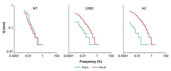 Besides runoff, the runoff frequency represented by the ratio of runoff frequency in plot B to runoff frequency in plot A (TB/A) also increased with disturbance: 0.977, 2.292, and 7.250 in the NT, LRBC, and AC phases, respectively (Table 1). In the NT phase, surface runoff frequency was slightly higher in plot A as visualised in the flow-duration curve (FDC) in Figure 7. In the LRBC and AC phases, despite a decrease in surface runoff frequency in plot A, surface runoff frequency in plot B have increased. The FDC of plot B also became more convex, which is a sign of increased frequency of high-magnitude surface runoff.