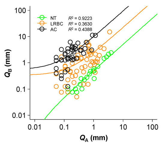Figure 9 shows the relationships between surface runoff in plot B (QB) and surface runoff in plot A (QA) in the NT, LRBC, and AC phase. The resulting GLM equations are: