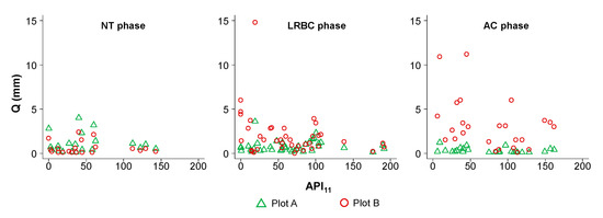 Naturally, surface runoff is directly proportional to rainfall and inversely proportional to API. In our study, the relationship QB/QA vs. API11 is only significant in the LRBC phase (QB/QA = −0.014861·API11 + 3.863; p > 0.01).