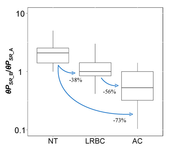 The amount of rainfall required for surface runoff generation (rainfall threshold, denoted by “θPSR”) was also evaluated (Figure 12). With decreasing interception (NT to LRBC to AC phase), the rainfall threshold decreased accordingly (Figure 12). Pi and API did not have significant influence on rainfall threshold; thus, rainfall threshold between the different phases was assessed via the Mann–Whitney U test. Rainfall threshold in plot B normalised by that in plot A (θPSR_B/θPSR_A) is 38% lower when moving from the NT to LRBC phase. When moving from NT to AC, and LRBC to AC, θPSR_B/θPSR_A is 73% and 56% lower, respectively. Differences in rainfall threshold were statistically significantly different between the NT, LRBC, and AC phases (Mann–Whitney, p < 0.01).