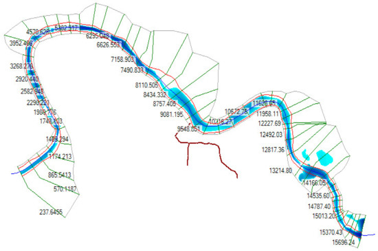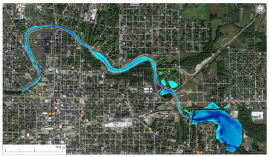 The reservoir operation model, interfaced with the genetic algorithm (GA) in MATLAB, starts generating the possible solutions for determining the reservoir releases over the next Δt using the current and forecasted data. The reservoir operation model and the genetic algorithm solver succeed in keeping the reservoir storage within the desirable range, while the storage for the reservoir is kept above the inactive storage and below the maximum flood storage, thus preventing any potential dam failure. Results are presented in the form of channel and floodplain inundation maps. The flooding condition (maximum inundation area downstream of the dam), assuming a fully open gate, is illustrated in Figure 7 in blue. Figure 8 shows the maximum inundation area (in blue) using the reservoir operation determined by the optimization-simulation model.