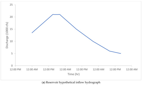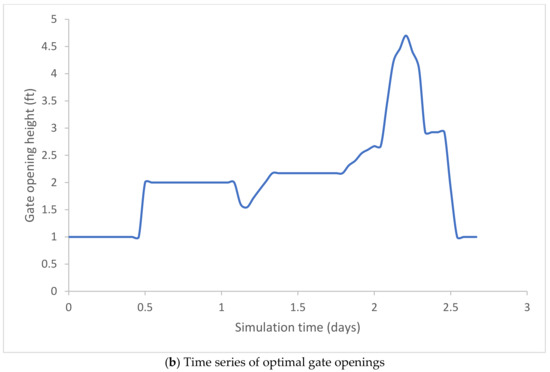 The hypothetical inflow hydrograph to the reservoir is shown in Figure 6a. A computation interval Δt of one hour is used starting at time t = 0. The objective is to determine the optimal sequence of reservoir gate openings to maintain for the targeted downstream water surface elevations below a maximum level during the flooding event. These time series of gate openings should achieve downstream water surface elevations within the allowable range of elevations at the points of interest. The resulting optimal gate openings as a function of time are shown in Figure 6b.