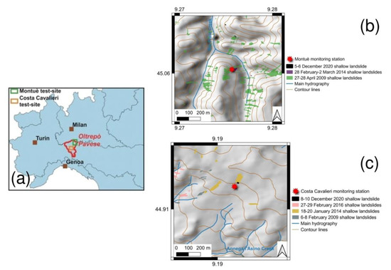 Location of the test-sites (a) and geomorphological and shallow landslides for Montuè (b) and Costa Cavalieri (c) test-sites.