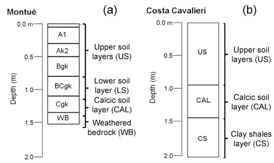 Representative soil profiles of the test-sites: (a) Montuè; (b) Costa Cavalieri.