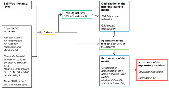 All the daily predictors were used to train models of SWP prediction for each of the considered statistical techniques. The dataset was divided into a training and test subset, where the training was bigger than the test one. In particular, the first 75% of the temporal series constituting the dataset was used to train a model, while the remaining 25% of the temporal series represented the subset for test and validation. These percentages were chosen to obtain a long set of acquisition required to build a model able to represent all the possible hydrological conditions the soil layers could experience [35,37].