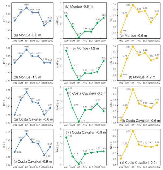 Values of the statistical indexes used to evaluate the performance of the different machine learning models used to simulate SWP trends of the test datasets: (a) R2 for Montuè at 0.6 m from ground; (b) MAE for Montuè at 0.6 m from ground; (c) NS for Montuè at 0.6 m from ground; (d) R2 for Montuè at 1.2 m from ground; (e) MAE for Montuè at 1.2 m from ground; (f) NS for Montuè at 1.2 m from ground; (g) R2 for Costa Cavalieri at 0.6 m from ground; (h) MAE for Costa Cavalieri at 0.6 m from ground; (i) NS for Costa Cavalieri at 0.6 m from ground; (j) R2 for Costa Cavalieri at 0.9 m from ground; (k) MAE for Costa Cavalieri at 0.9 m from ground; (l) NS for Costa Cavalieri at 0.9 m from ground. ANN: Artificial Neural Networks; SVM: Support Vector Machines with radial kernel; RF: Random Forests; RVM: Relevance Vector Machines; BLR: Bayesian Linear Regression; GBRT: Gradient Boosting Regression Trees; DLRN: Deep Learning Regression Network.