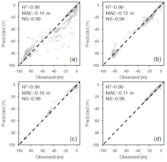 Performance indexes of the SWP models obtained by different statistical methods based on the training dataset were similar, in the range 0.90–0.99, 0.01–1.03 m and 0.90–0.99 for R2, MAE and NS, respectively. The highest differences on the performance of the different statistical techniques were more evident considering the models for the test sets (Figure 4), allowing to determine the best machine learning method able to predict SWP trends in different soil layers.