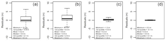 Boxplot of the residuals of the simulation of the best machine learning method (Random Forests) for the different soil levels through the test datasets: (a) Montuè at 0.6 m from ground; (b) Montuè at 1.2 m from ground; (c) Costa Cavalieri at 0.6 m from ground; (d) Costa Cavalieri at 0.9 m from ground.