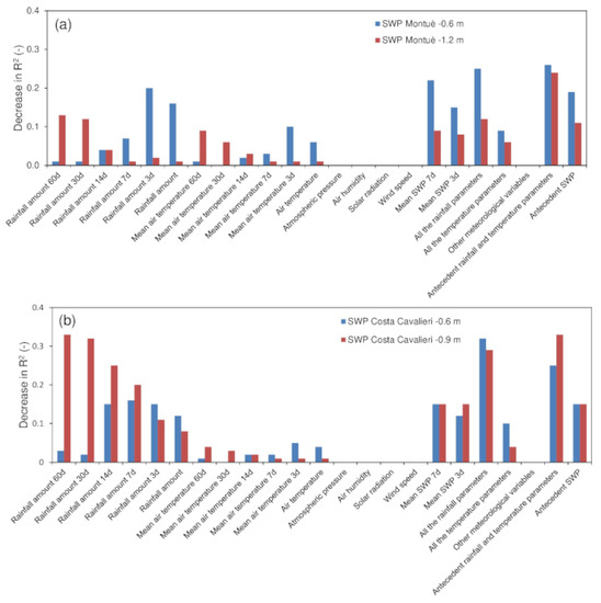 Furthermore, atmospheric pressure, air humidity, solar radiation and wind speed had nil effects on the performance of these models, since their permutation did not provoke any reduction in R2. As for the prediction models of the soil layers at 0.6 m from ground, the impact of antecedent SWP (average SWP of the previous 3 and 7 days) was evident for the correct estimation of the actual daily water potential. The decrease in R2 was of 0.17–0.18 at 1.2 m in Montuè test-site and of 0.15 at 0.9 m in Costa Cavalieri slope.