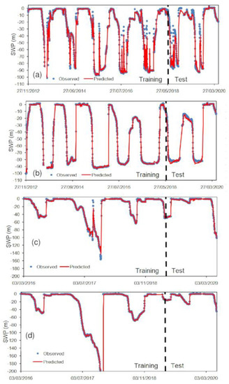 Comparison between observed and simulated SWP of the best machine learning method (Random Forests) for the different soil levels through the test datasets: (a) Montuè at 0.6 m from ground; (b) Montuè at 1.2 m from ground; (c) Costa Cavalieri at 0.6 m from ground; (d) Costa Cavalieri at 0.9 m from ground.