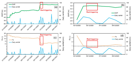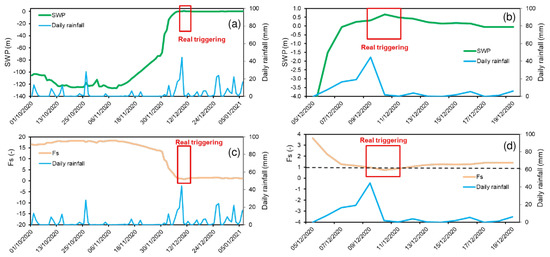 Further unstable conditions (Fs < 1) were not modeled in the remaining days of the analyzed time span, even if Fs kept in the range of (1.1, 1.5) due to SWP conditions identifying close-to-saturation or completely saturated soils (Figure 9c and Figure 10c).