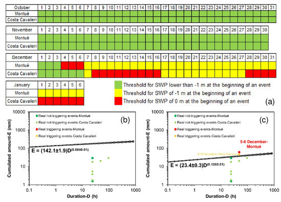The reliability in the selection of the most adapted threshold for each day since the use of the modeled values of SWP was confirmed when the prediction of stable and unstable conditions was carried on. All the rainfall events of the analyzed period, when SWP was between −1 and 0 m at the beginning of the event, felt correctly below the corresponding threshold, since no shallow landslides were triggered in the test-sites in similar conditions during the analyzed time span (Figure 11b). As regards to the events when SWP was equal to 0 m at the beginning of the rainfall, the two real triggering events occurred in Montuè and Costa Cavalieri during the analyzed time span were located correctly above this threshold, while the other events were placed below it, confirming that no shallow failures occurred during those rainfalls (Figure 11c).