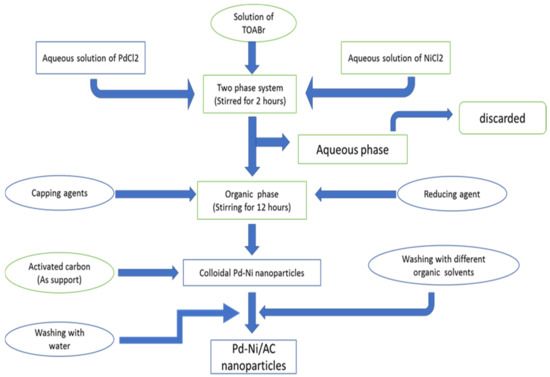 Pd–Ni nanoparticles were synthesized in a two-phase liquid system with slight modification in the reported procedure by adding capping agents, such as oleylamine and oleic acid [75]. About 5.6 mL of aqueous solution of PdCl2 (0.022 M) and 5.6 mL of aqueous solution of NiCl2 (0.033 M) were added to a solution of tetraoctylammonium bromide (ToABr) as a phase-transfer agent in toluene (0.538 g of TOABr in 37 mL of toluene). Then, the solutions were stirred for 2 h. The toluene phase was thereafter separated from the aqueous phase and discarded. The capping agent (23.4 µL of oleic acid and 46 µL of oleylamine) was then added to the mixture and was stirred for another 30 min. To reduce the Pd2+ to Pd0 and Ni2+ to Ni0, 35 mL of NaBH4 solution (0.2 M) was drop wise added into the reaction mixture and stirred for 12 h. After completing the process, the Pd–Ni colloidal particles were obtained, which were then washed with a dilute solution of KOH (5 mM) and distilled water. To support the Pd–Ni particles on the activated carbon, 80 mg of powdered activated carbon was added. After the addition of activated carbon, the mixture was stirred for 12 h. Then, the Pd–Ni powder supported on the activated carbon (Pd–Ni/AC) was separated and purified with chloroform, acetone, toluene and ethanol [75]. The prepared powders were kept in an oven at 70 °C for 2 h and stored in bottles. The summary of the entire procedure is shown in Figure 2.