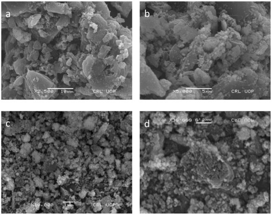 The surface morphology of Pd–Ni/AC was determined by SEM analysis. The SEM images are given in Figure 3a–d. The micrographs show rough interfaces along with many holes and nanoparticles spreading over the material. Overall, the surface shows irregular particle channels for the adsorption of the specified dye.