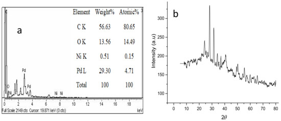 Figure 4a shows the EDX elemental analysis of the prepared adsorbent. The results show that elemental atomic weight percentages of Pd–Ni/AC were found to be: C (56.63%), O (13.56%), Pd (29.30%) and Ni (0.51%). Similarly, Figure 4b presents the XRD pattern for the Pd–Ni/AC adsorbent. According to the Scherer formula, the calculated crystallite size is 7.4 nm while the crystallinity is determined to be 83%. Moreover, the characteristic peaks confirm the existence of the Pd–Ni alloy formation.