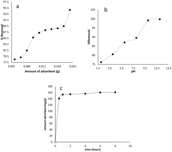 It was found that the extent of dye removal was improved by increasing contact time, and a maximum value was reached after 30 min. Figure 5c demonstrates that after 30 min contact time, there was no significant effect on dye adsorption observed. Thus, a 30 min reaction time was considered to be the optimum contact time.
