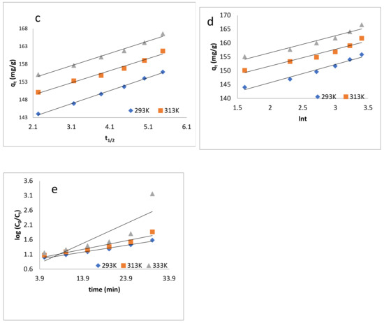 A plot of lnqe versus Ce enables us to determine the values of the above parameters from the slope and intercept (Figure 7d–f), the values of which are given in Table 4. The values of 1/n were: 0.3181, 0.3139 and 0.3379 at 293, 313 and 333 K, respectively, which indicates that the adsorption process was energetically favorable.