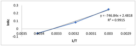 ΔG°, ΔH°, ΔS°, Kc and Ka are the changes in Gibbs free energy, enthalpy, and entropy; the ratio of equilibrium adsorption; equilibrium concentration and the Langmuir constant, respectively. These values are given in Table 5, while the Van’t Hoff plot is given in Figure 8.