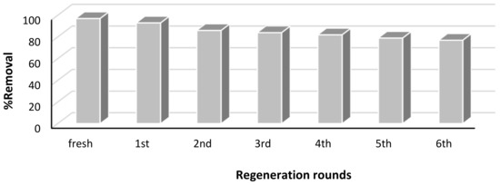 To determine the regeneration efficiency of Pd–Ni/AC, the sample was washed with suitable eluents (dilute sodium hydroxide and ethanol) and then used several times, and the removal efficiency was monitored. From Figure 9 it was found that the removal efficiency was reduced up to 79% after six rounds of regeneration, showing that Pd–Ni/AC can be used with a sufficient efficiency up to several cycles.