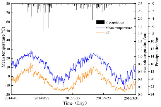 Daily precipitation, evapotranspiration, and mean temperature observed at the Ji county weather station from 1 April 2014, to 31 March 2016.