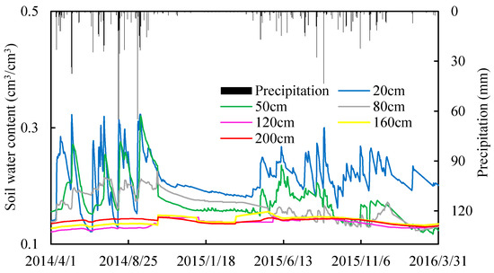In addition, there were significant differences in the soil water content at different depths after rainfall. The soil surface moisture, especially the parts above 80 cm, was more sensitive to rainfall events with high amounts and intensities, and the soil water content ranged from 13.8% to 36.7%. During the observation period, there were three large-scale rainfall events in 2014, and the total precipitation was 71.1 mm, 123.6 mm, and 126.6 mm during these events. The soil water increments within 80 cm during the three rainfall events increased by 8.27%, 10.36%, and 13.24%, but the increase in the average soil water content between 100 cm and 200 cm was insignificant (less than 1%). The infiltration of the rainwater rapidly increased the water content of the surface soil, while the water content of the deep soil was low at that time. At the end of the rainy season, the soil water content decreased significantly within a few weeks. In particular, in the 10–50 cm soil layers, the soil water content decreased from 31.2% to 19.8% in 28 days. However, the soil moisture in the deep soil layers decreased at a very slow pace, and the soil dried out at a low rate throughout the dry season.