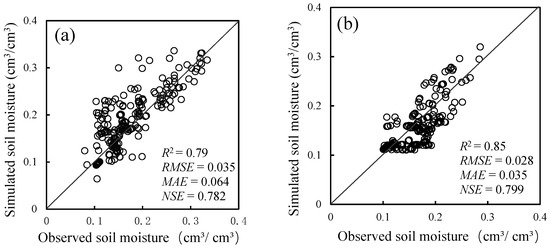 To analyze the accuracy of the HYDRUS-1D model, we compared the soil moisture observation data with the simulated data during the calibration period and the verification period (Figure 4). During the calibration period (Figure 4a), the data points tended to be distributed above the y = x line, indicating that the simulated water content was slightly higher than the measured water content; during the validation period (Figure 4b), the data tended to be distributed below the y = x line, indicating that the simulated value was slightly lower than the observed values. The evaluation index results for the calibration and validation periods showed that the R2, NSE, RMSE, and MAE values of the calibration period were 0.79, 0.782, 0.035, and 0.064, respectively, and the R2, NSE, RMSE, and MAE values for the validation period were 0.85, 0.799, 0.028, and 0.035, respectively. The evaluation results for the verification period showed that the simulation process had a slight improvement and optimization. In most studies that used the Hydrus-1D to simulate the soil water dynamics in the Loess Plateau, the R2 and RMSE values were mostly 0.7–0.84 and 0.015–0.063, respectively, when optimizing the hydraulic parameters [21,33]. When calibrating the hydraulic parameters in this study, the R2 was 0.85, the RMSE was 0.028, and the evaluation index values were both within the range of the noted evaluation index results, indicating that the effectiveness of the model was acceptable, and the simulation values were in good agreement with the observed value. Thus, the optimized hydraulic parameters were appropriate for the simulation of soil water movement in the study area.