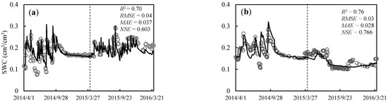 Comparison between the simulated and observed soil water contents: (a) the calibration period, and (b) the validation period, n = 252.