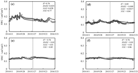 Comparison of the simulated and observed soil water contents at typical soil depths. The hollow circles represent the measured soil water contents, and the solid lines represent the simulated soil water contents. SWC is soil water content: (a) 20 cm, (b) 50 cm, (c) 80 cm, (d) 120 cm, (e) 160 cm, (f) 200 cm.