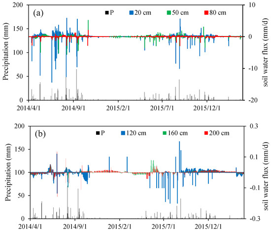 Changes in the soil water flux in the different soil layers and the precipitation distribution: (a) variations in the 20 cm, 50 cm, and 80 cm soil layer; and (b) variations in the 120 cm, 160 cm, and 200 cm soil layer. Note that the y-axis limits were adapted to the lower values in (b).