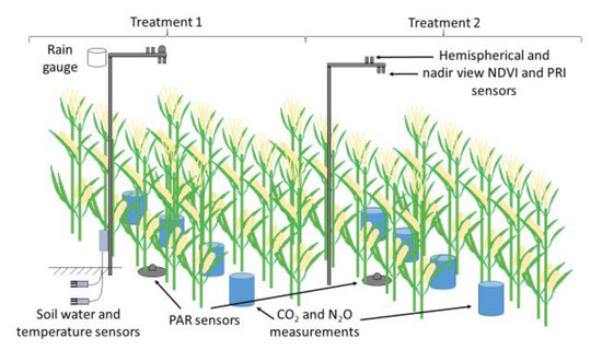During the second year of the experiment, a photosynthetically active radiation (PAR) sensor (Apogee Instruments, Logan, UT, USA) was placed at 2.5 m above the ground and the information was used as reference PAR data of radiation reaching the leaf surface. Both treatments received a PAR sensor, which was placed below plant replicates, ensuring the same distance from plant stems for the treatments. This setup enabled us to continuously measure the photochemical response of four partial plants per treatment. From the measured PAR values we calculated the fraction of the absorbed PAR (fAPAR) as a difference of the hemispherical and below canopy radiation flux over the below canopy radiation flux [42]. Only data from midday (10:00–13:00) were used; all other measurements were omitted. Photon flux values are presented in µmol m−2 s. At the same time with the PAR sensors, spectral reflectance sensors of Photochemical Reflectance Index (PRI) and Normalized Difference Vegetation Index (NDVI; Decagon Devices, Pullman, WA, USA; measuring 532 and 570 nm and 630 and 800 nm spectral irradiance, respectively) were included in the experimental setup. One hemispherical sensor was placed 2.5 m above ground, and two PRI sensors (nadir field view) were placed at the same distance from two plant replicates’ meeting point in terms to collect data on entering and reflecting the 532 and 570 nm or 630 and 800 nm wavelengths of the sunlight. The schematics of the experimental setup is shown in Figure 1.