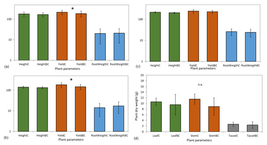 Maize growth of height (cm), crop yield (g), and root dry weight (g) for (a) the two-year averages, (b) 2017, (c) 2018 and (d) aboveground biomass in control (C) and biochar (BC) amended soils. * indicates statistically significant differences between treatments. n.s. represents no significant differences.