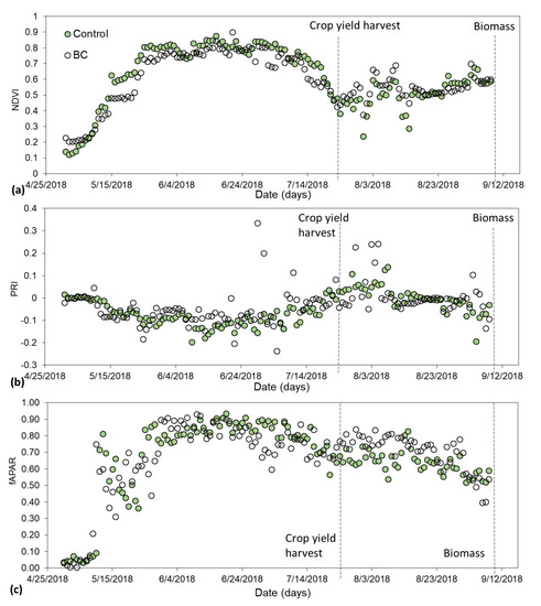 Average midday values of (a) normalized difference vegetation index (NDVI), (b) photochemical reflectance index (PRI), and (c) fraction of absorbed photosynthetically active radiation (fAPAR) data for the control and biochar (BC) treatments during vegetation growth in 2018. Dotted lines represent the times of crop yield and biomass harvests.