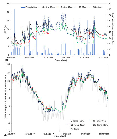 Changes in (a) soil volumetric water content (VWC) and (b) soil temperature as influenced by biochar (BC) addition.