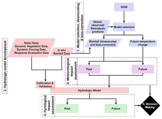 Climate change enhanced by global warming is progressing faster than ever before []. Global warming is sensed most directly through water, as the phenomenon is inseparably connected to the water cycle, thus imposing threats on sustainable development, biodiversity, and ecosystems [,]. In the recent past, climate-related hazards such as floods, storms, heatwaves, and droughts have caused the majority of disasters globally [,]. As far as risk is a function of threat, consequence, and vulnerability [,], increased threat causes abrupt damages to vulnerable societies. As a result, in 2015, the Sendai Framework for Disaster Risk Reduction (SFDRR) was formulated by global leaders to strengthen the resilience of societies to disasters [] and has since been practiced hand-in-hand with two other global agreements: the 2030 Agenda for Sustainable Development and the Paris Agreement [,]. In these circumstances, climate change impact assessment is essential for each country to understand the risk they may face as the first Priority for Action of SFDRR to manage disaster risks, implement mitigation measures, and strengthen adaptation mechanisms.