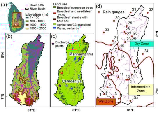 (a) Topographical map of Sri Lanka with the demarcation of the Mahaweli River basin, (b) topography of the Mahaweli River basin, (c) land use with distribution of discharge measurement points, and (d) demarcation of climatic zones with rain gauge network.