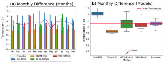 Basin average temperature difference (future—past): (a) bar plot for monthly changes; and (b) box-and-whisker plot for annual changes.